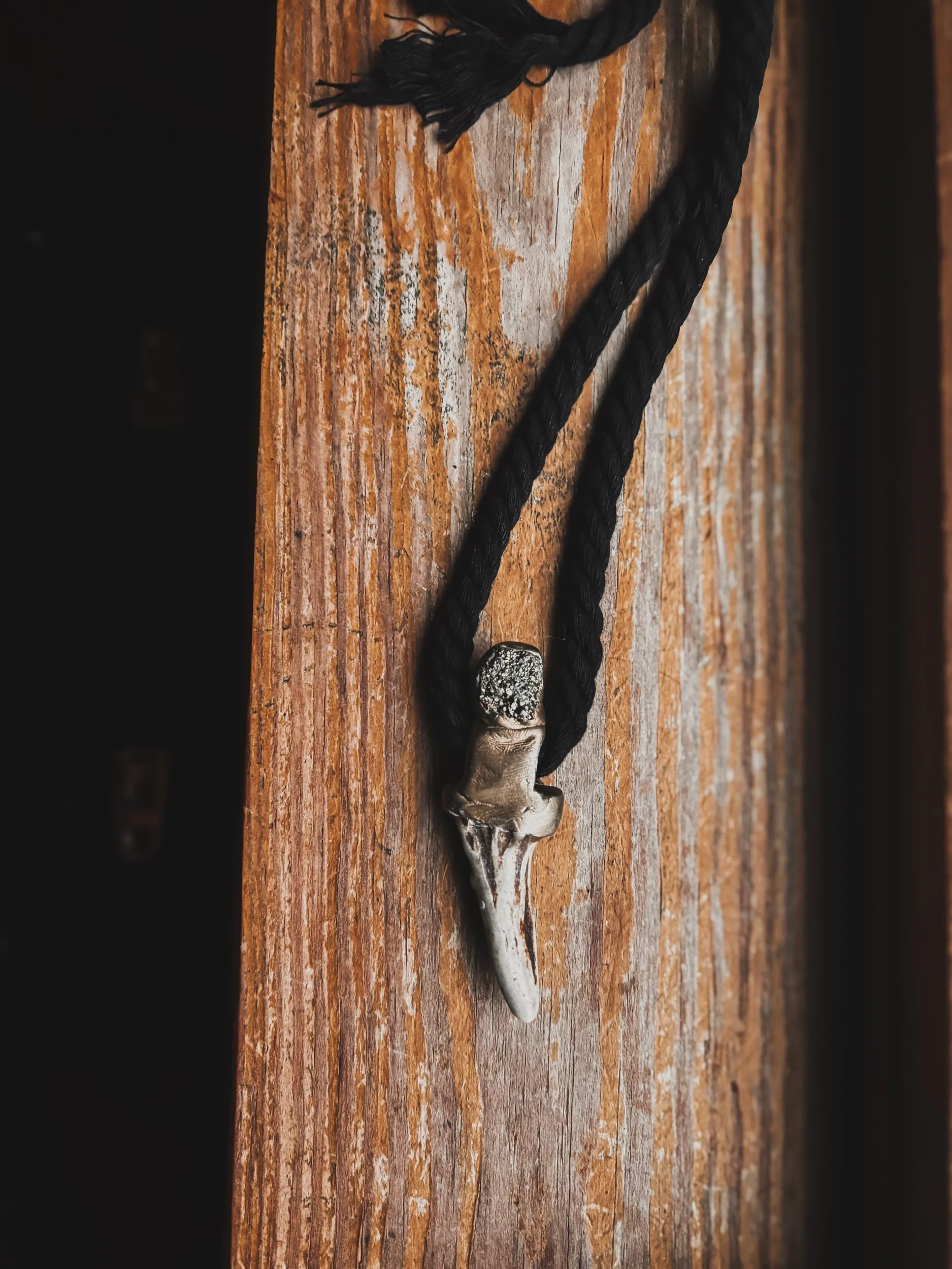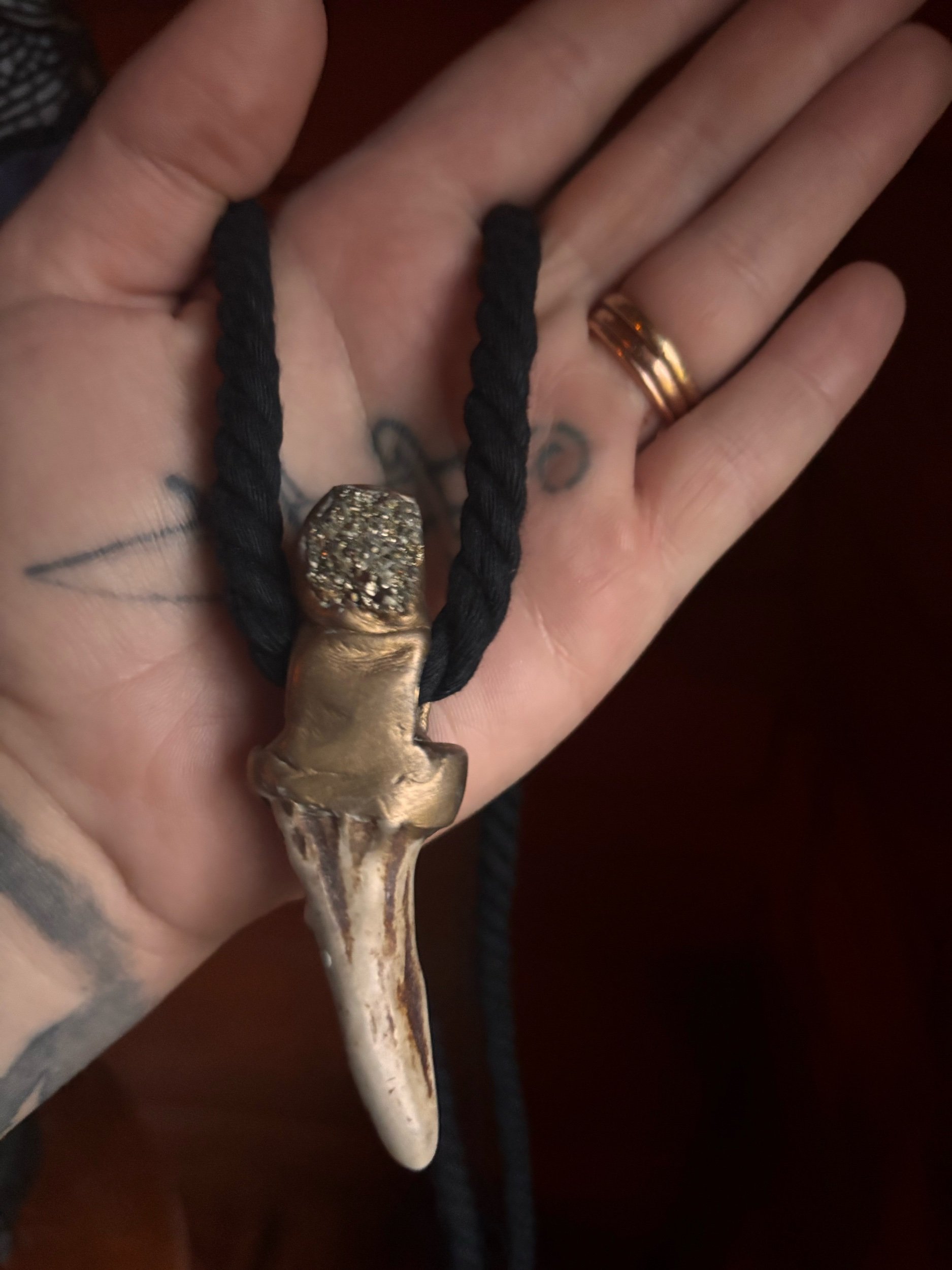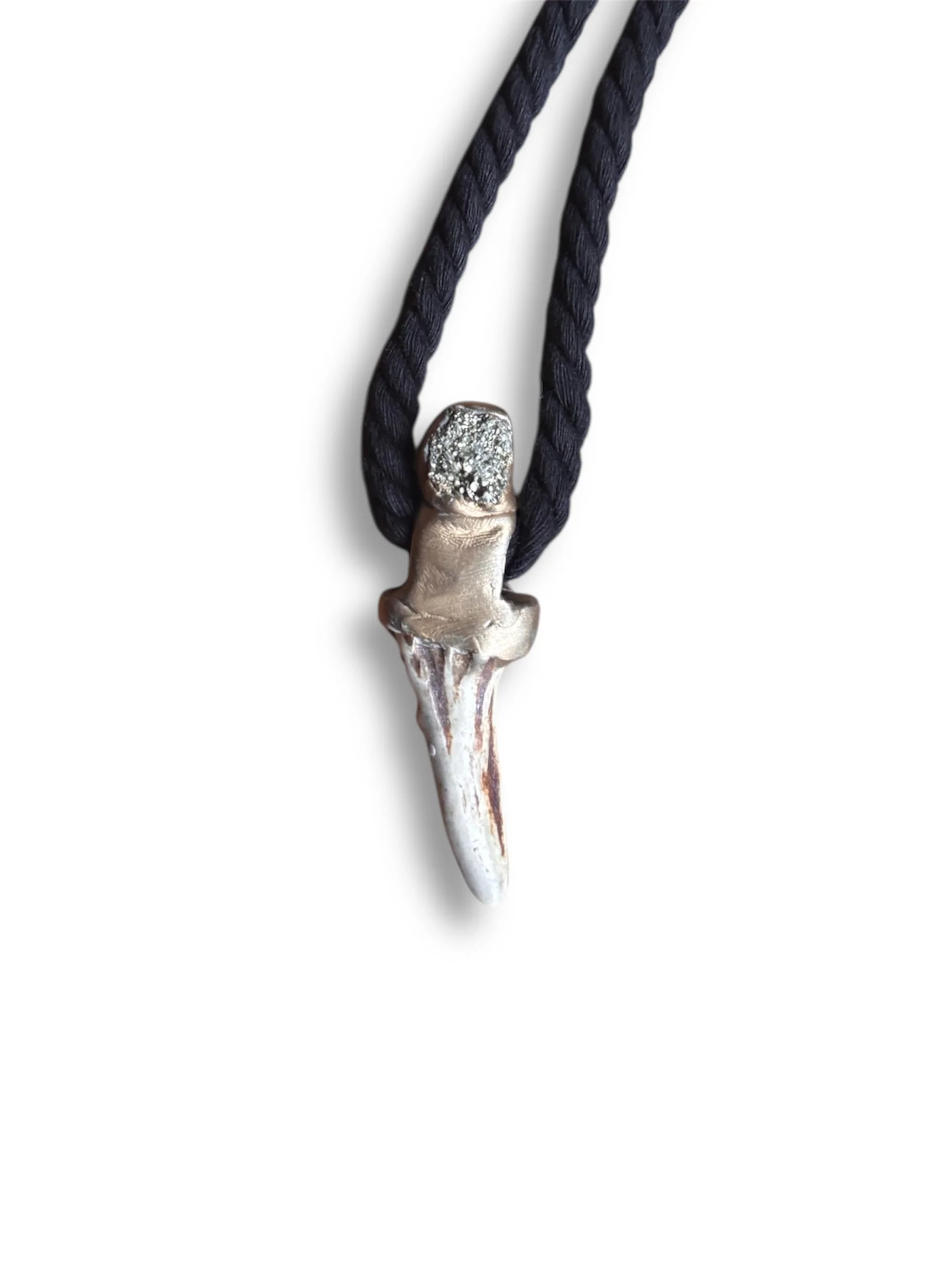 Suspended below, polished antler slices create a graceful, ceremonial cascade that moves with you — reminiscent of snowmelt drops, wind-bells, or the charms that might hang from a chieftainess’s winter cloak.