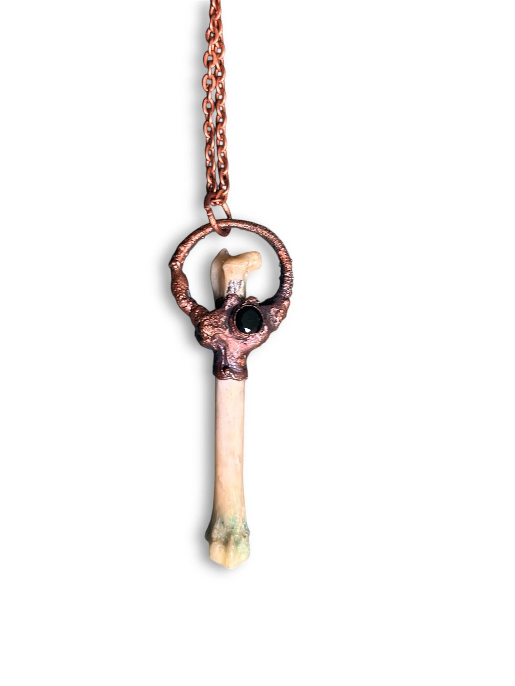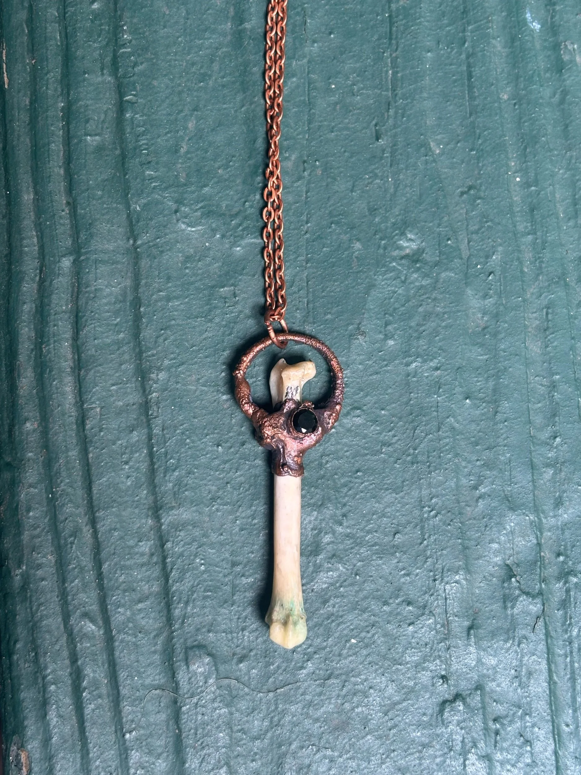 “Bone Chant” is crafted from real cat bones (ethically sourced and hand-painted a dark metallic silver), vintage bone beads, agate stone chips, and wooden accents.