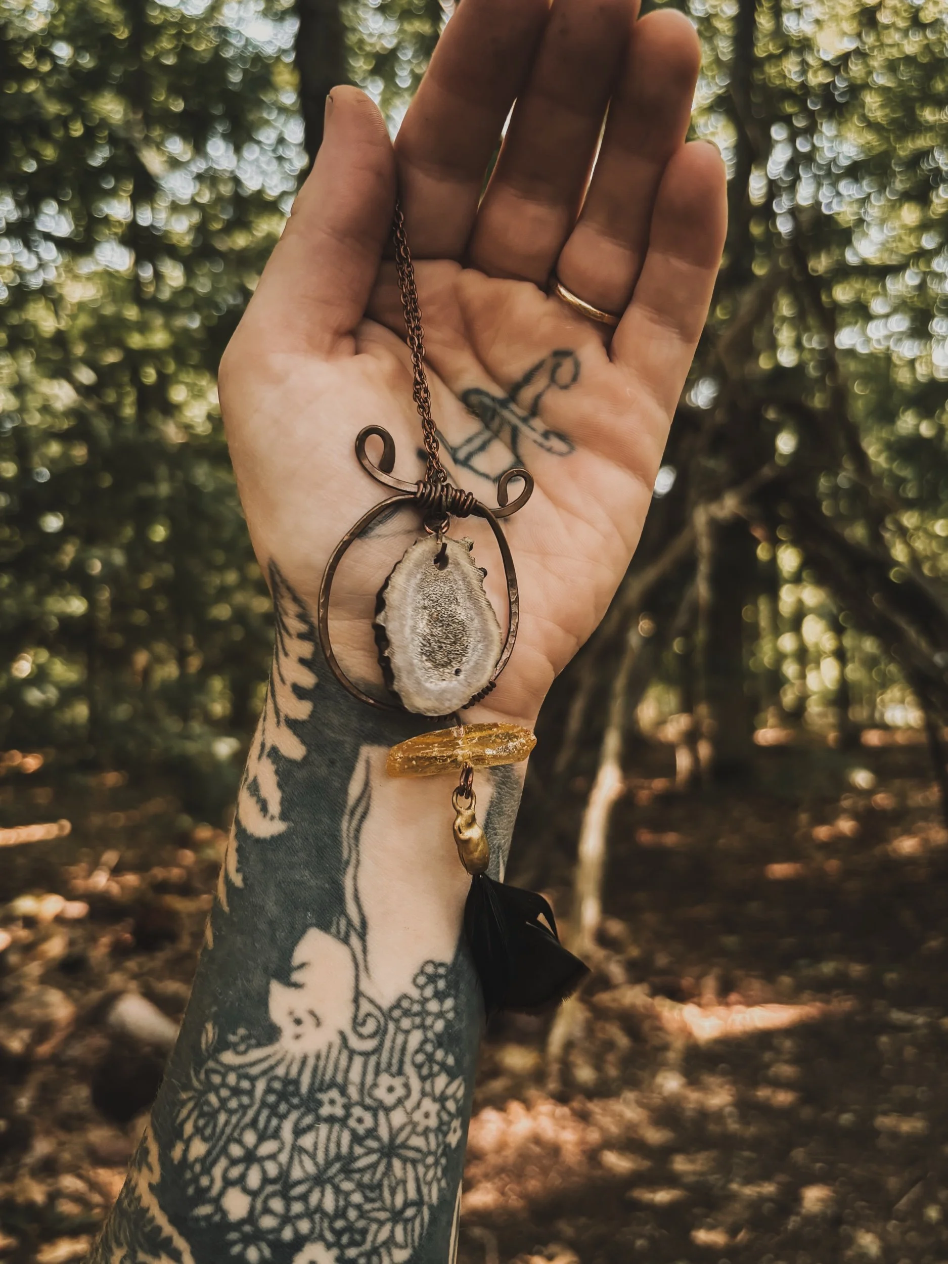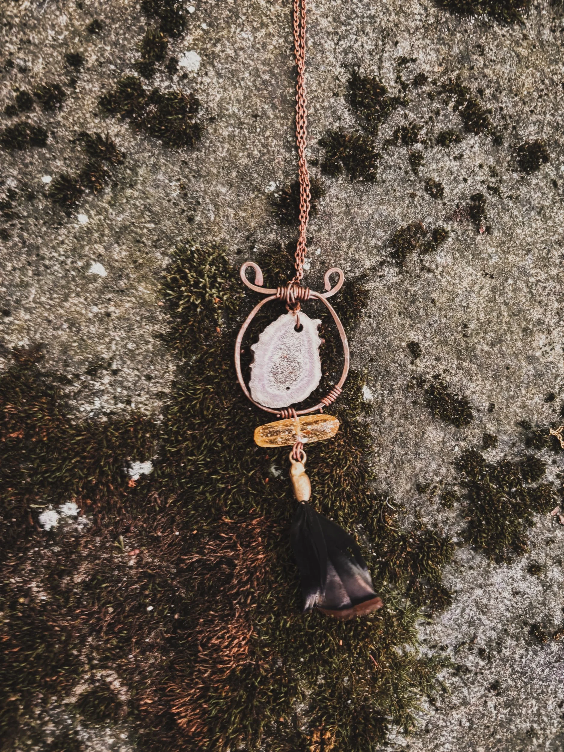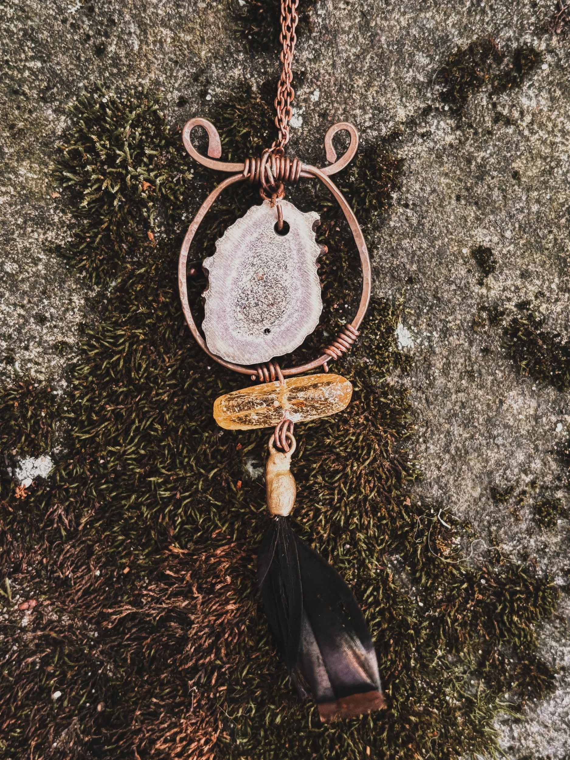 This amulet holds the storm and the stillness. A deep purple amethyst sits above a misty green moss agate, echoing a shoreline cloaked in sea fog. Together, they channel intuition, dreamwork, and grounding through nature’s wisdom.