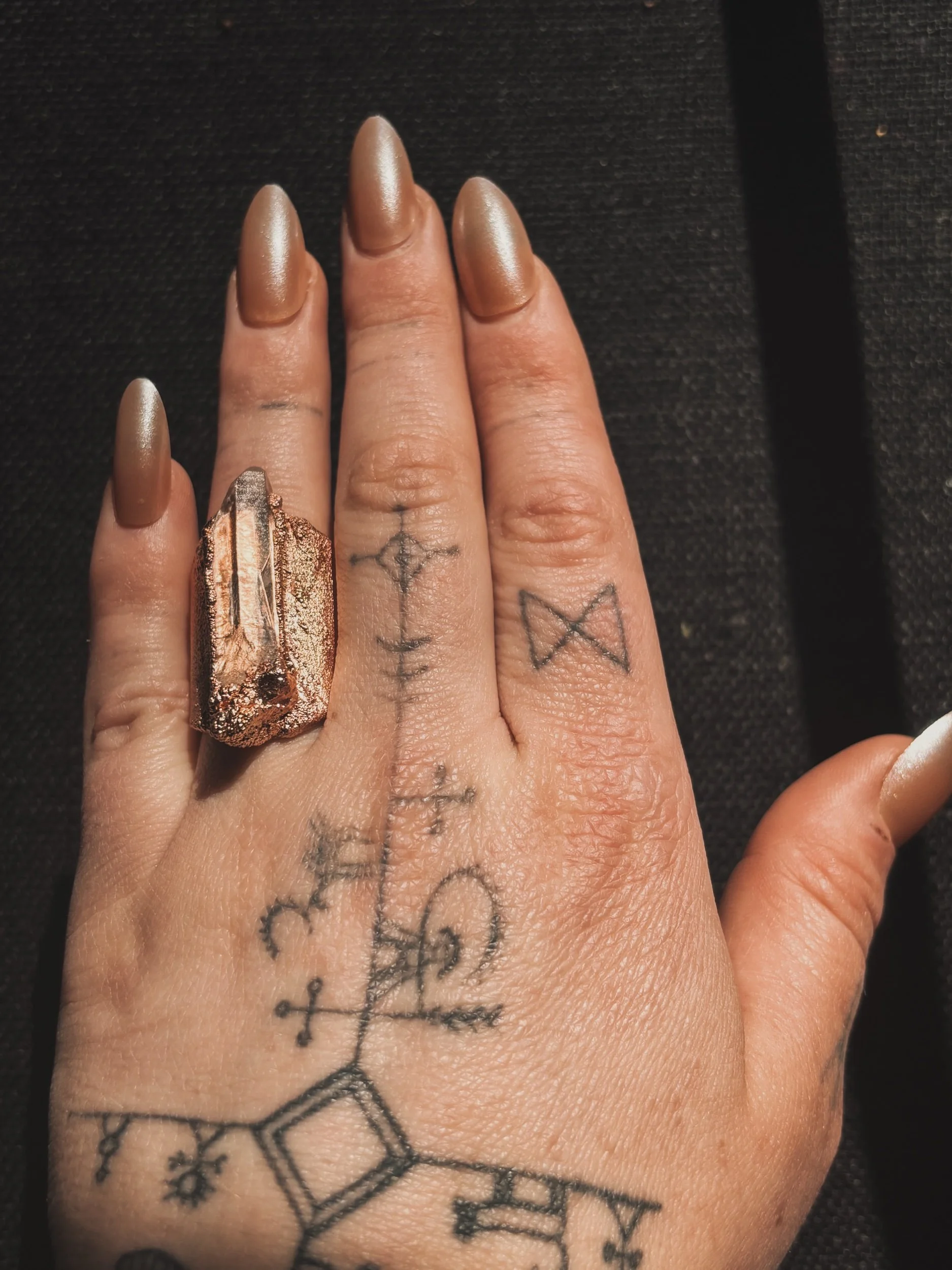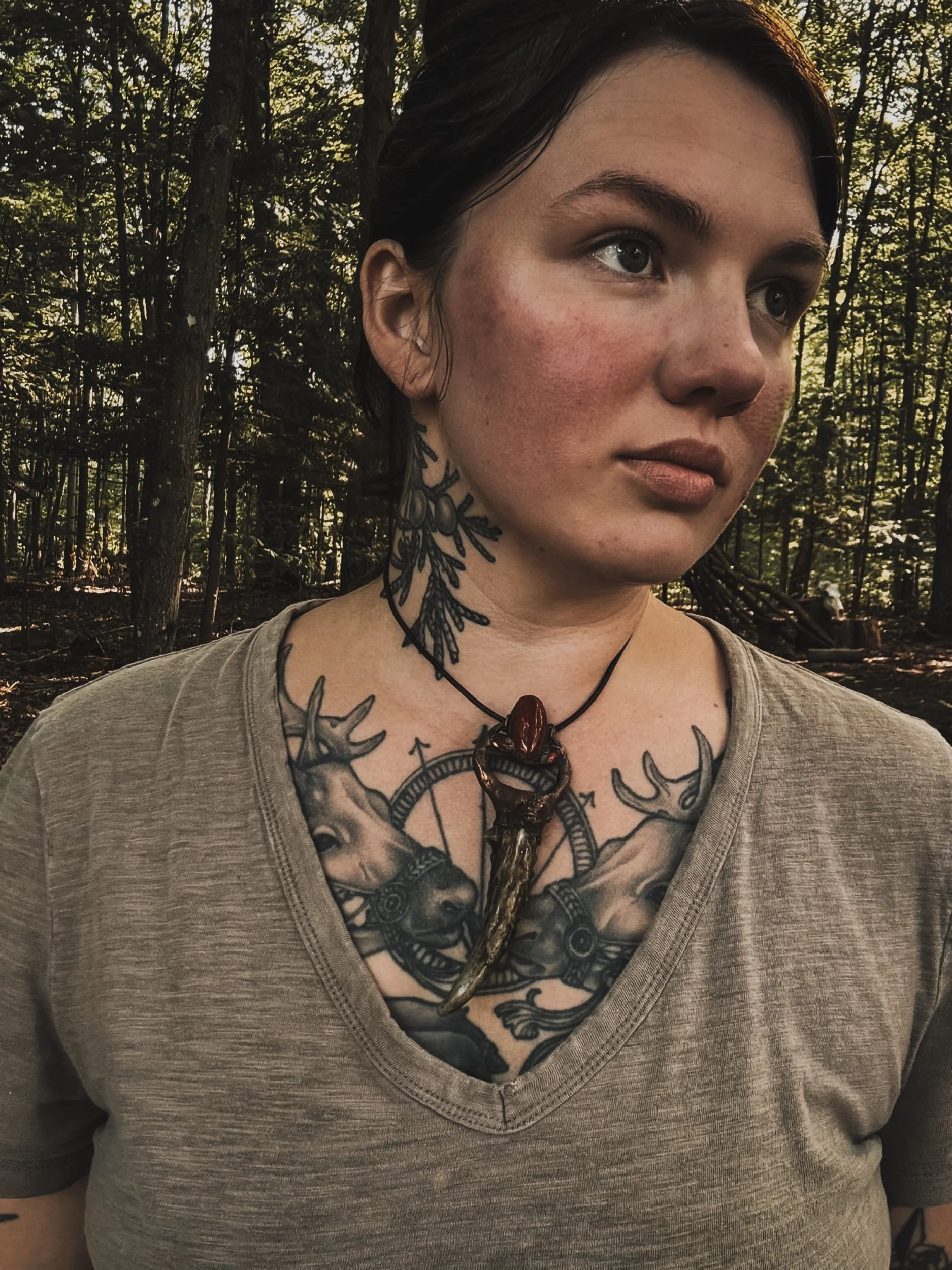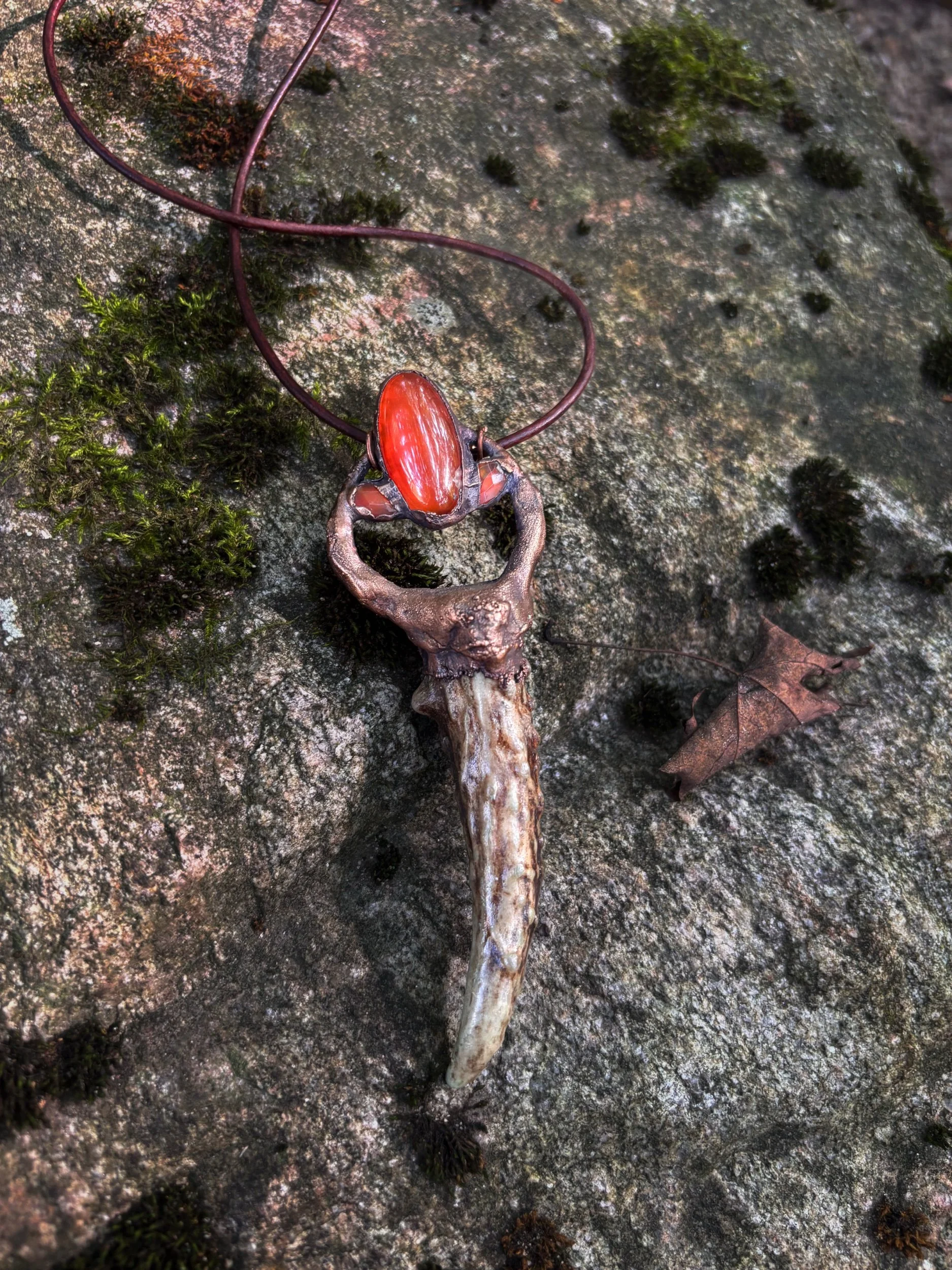 This amulet holds the storm and the stillness. A deep purple amethyst sits above a misty green moss agate, echoing a shoreline cloaked in sea fog. Together, they channel intuition, dreamwork, and grounding through nature’s wisdom.