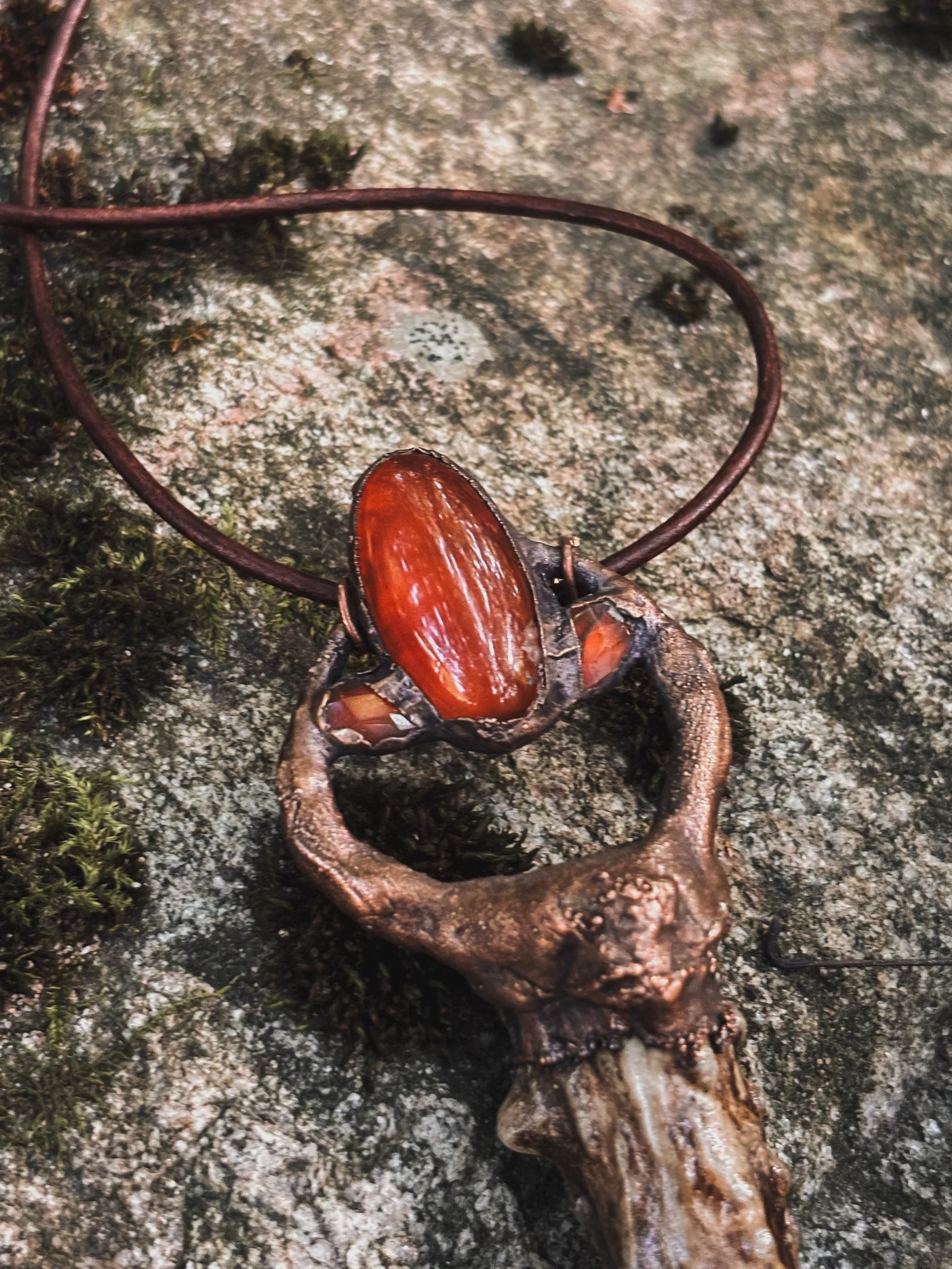 Materials: Amethyst, moss agate, soft solder (silvergleam), leather cord