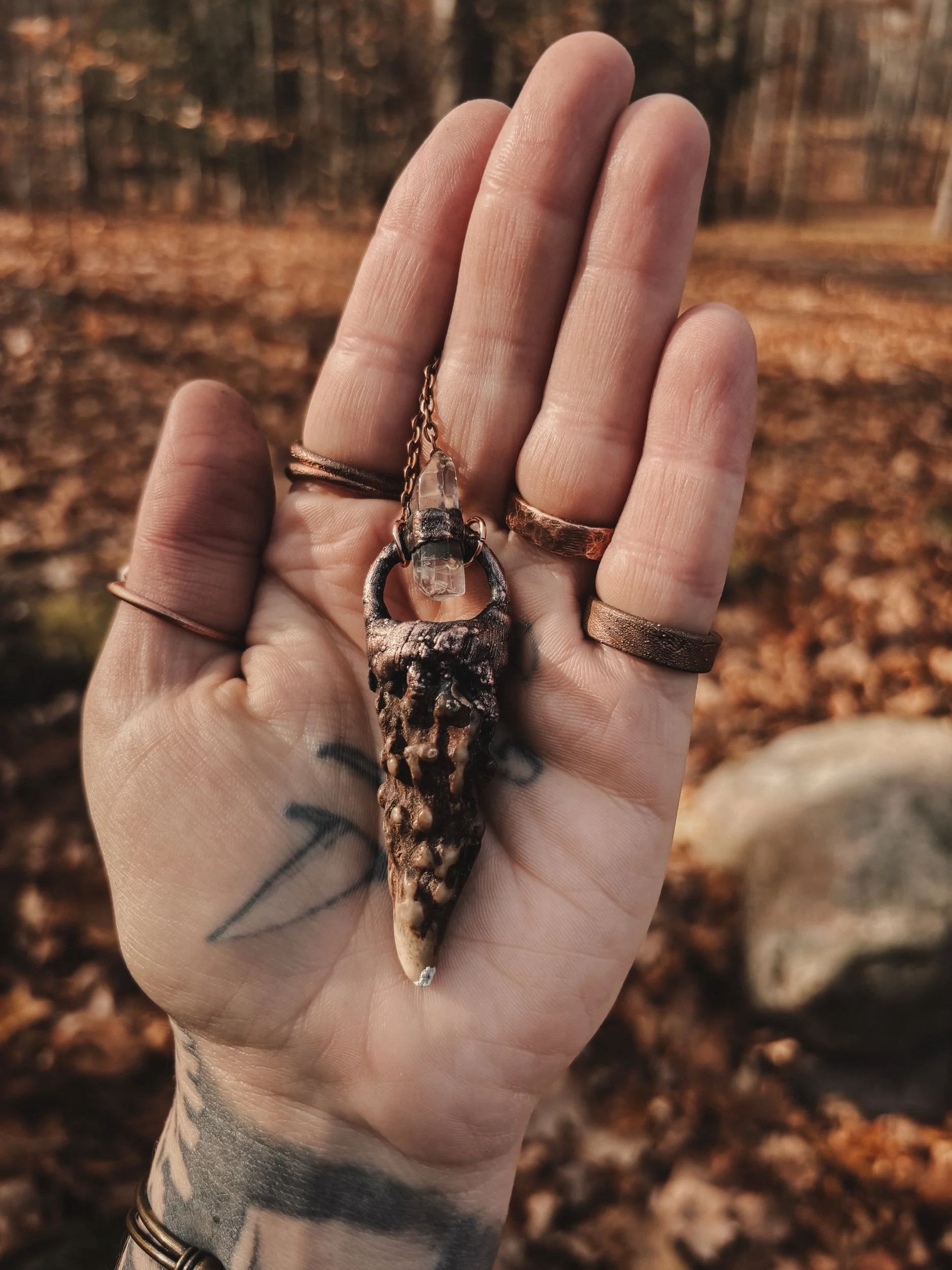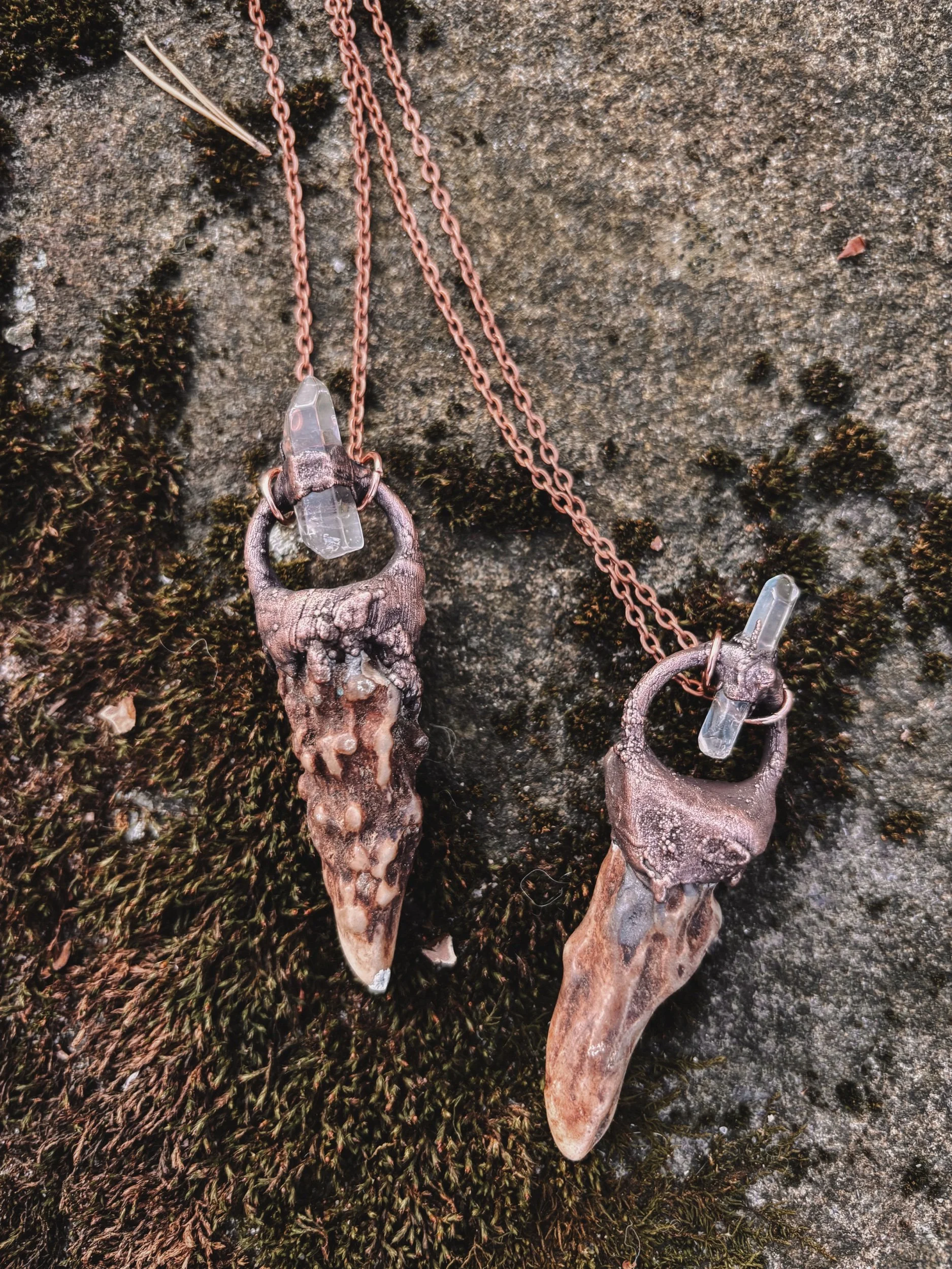 The overall look blends woodland oddity with old-world jewelry design — a mix of nature and ornament that works well for everyday wear or as an accent piece for more styled outfits.