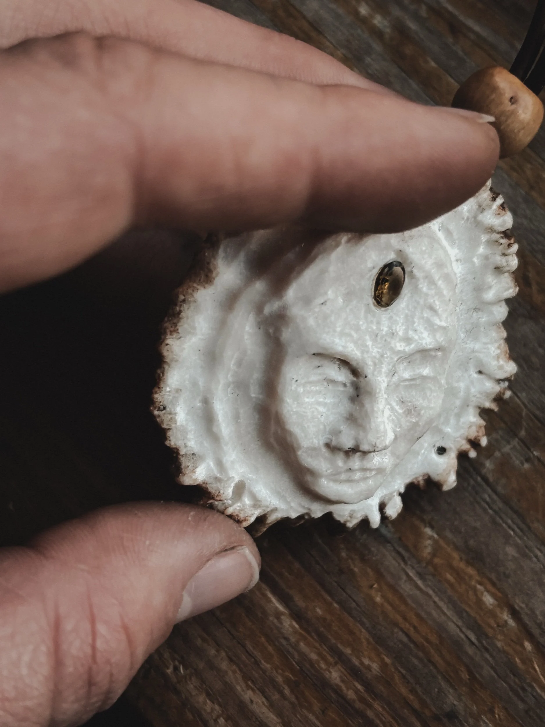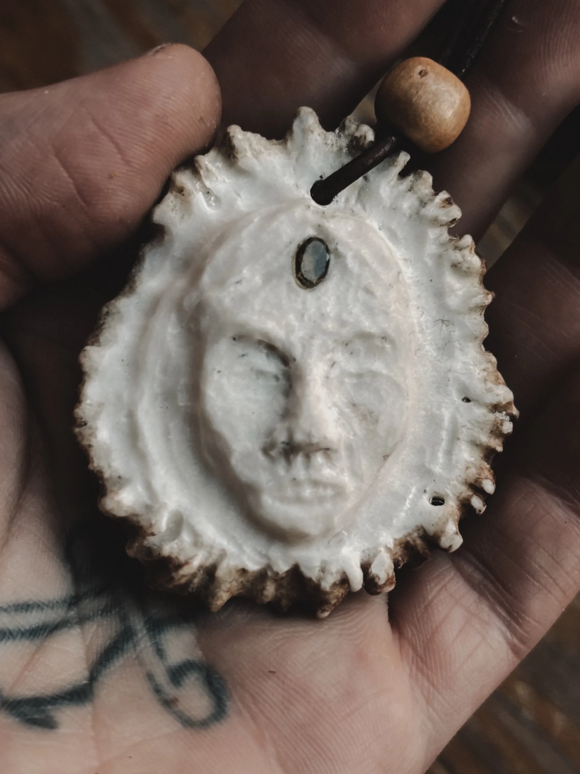 This handcrafted athame features an opalite blade with a frosted, iridescent finish, a natural antler handle, and a soft-soldered setting that holds a polished moonstone at the base of the blade. The result is a piece with a cool, wintery presence and a comfortable, organic grip.